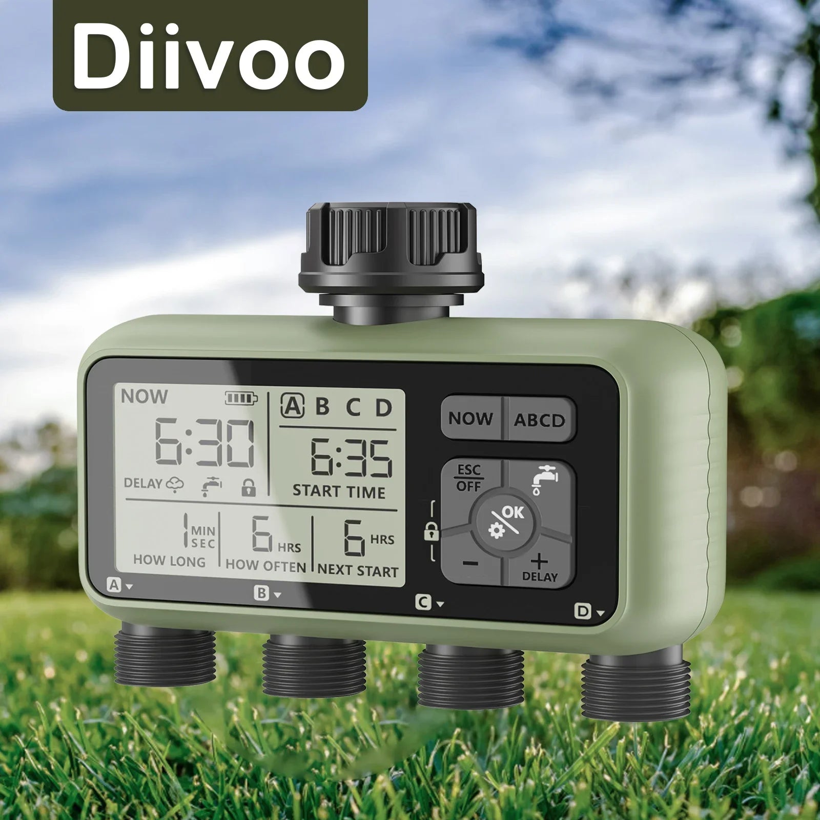 Diivoo Water Timer 4 Zone Garden Programmable Automatic Irrigation Timer with Rain Delay Manual/Auto Mode Watering for Lawn Yard